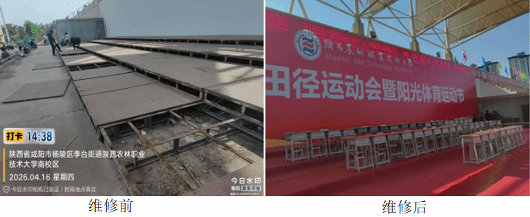 一是精准排查维修,筑牢场地安全防线。对各校区运动场地基础设施开展全面排查整治,重点对西校区操场跑道进行全方位修补、平整,对松动、破损的围栏进行加固,为师生安全运动筑牢基础;同时,对南校区操场主席台围墙进行全面清理、粉刷,对松动、破损的踏步面板进行维修、加固,保障了师生上下主席台的通行安全,为赛事开展奠定了良好基础。